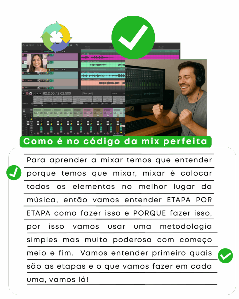 Um curso completo de mixagem profissional sem enrolação com metodologia e passo a passo + bônus de mixagens abertas para você treinar, plugins gratuitos, como precificar sua mixagem e guia de fones para mixagem.